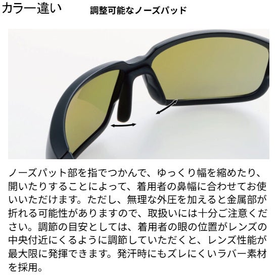 調節の目安としては、着用者の眼の位置がレンズの中央付近にくるように調節していただくと、レンズ性能が最大限に発揮できます。