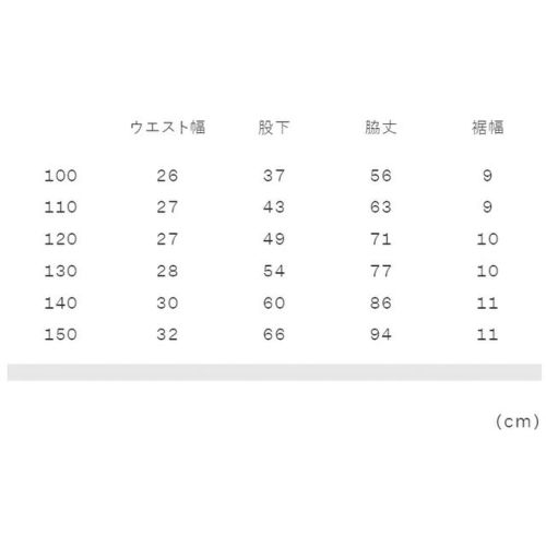 100:ウエスト幅26、股下37、脇丈56、裾幅9 110:ウエスト幅27、股下43、脇丈63、裾幅9 120:ウエスト幅27、股下49、脇丈71、裾幅10 130:ウエスト幅28、股下54、脇丈77、裾幅10 140:ウエスト幅30、股下60、脇丈86、裾幅11 150:ウエスト幅32、股下66、脇丈94、裾幅11 |