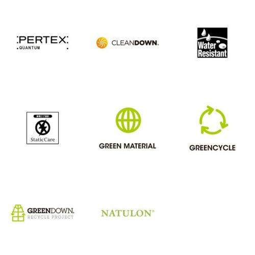 表地(コーティング等樹脂加工):40D Recycled Nylon Taslan Cloth(ナイロン100%) 中わた:GreenRecycled CLEANDOWN(ダウン80%、フェザー20%) 裏地:12D Recycled Nylon Light Rip with DWR(ナイロン100%) |