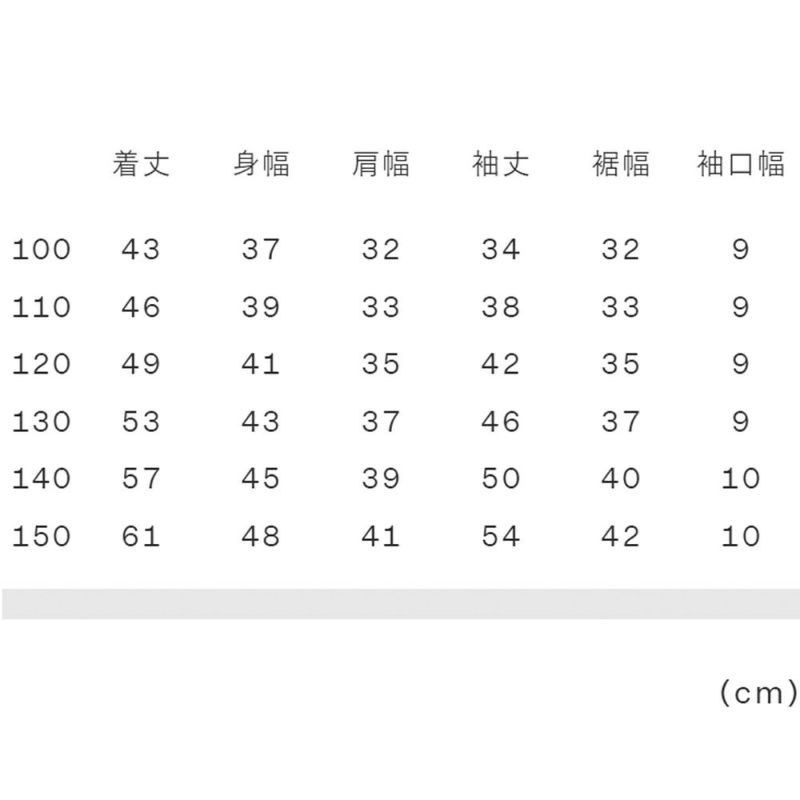 実寸サイズ(cm)100:着丈43、身幅37、肩幅32、袖丈34、裾幅32、袖口幅9