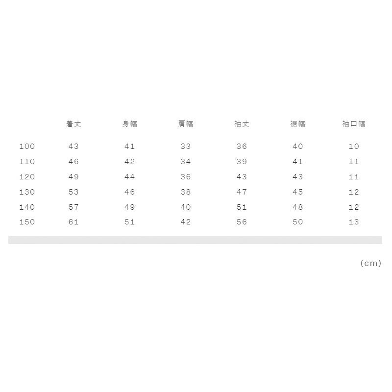 実寸サイズ(cm)100:着丈43、身幅41、肩幅33、袖丈36、裾幅40、袖口幅10