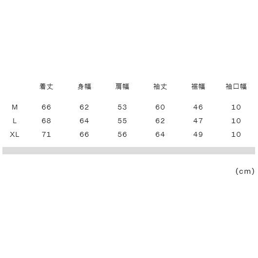実寸サイズ(cm)M:着丈66、身幅62、肩幅53、袖丈60、裾幅46、袖口幅10