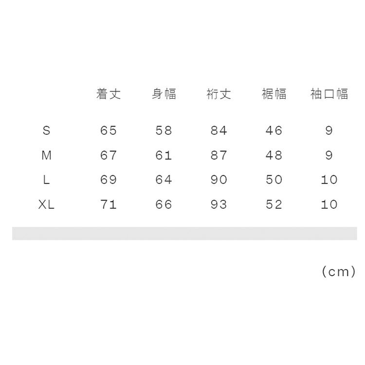 実寸サイズ(cm)S:着丈65、身幅58、裄丈84、裾幅46、袖口幅9