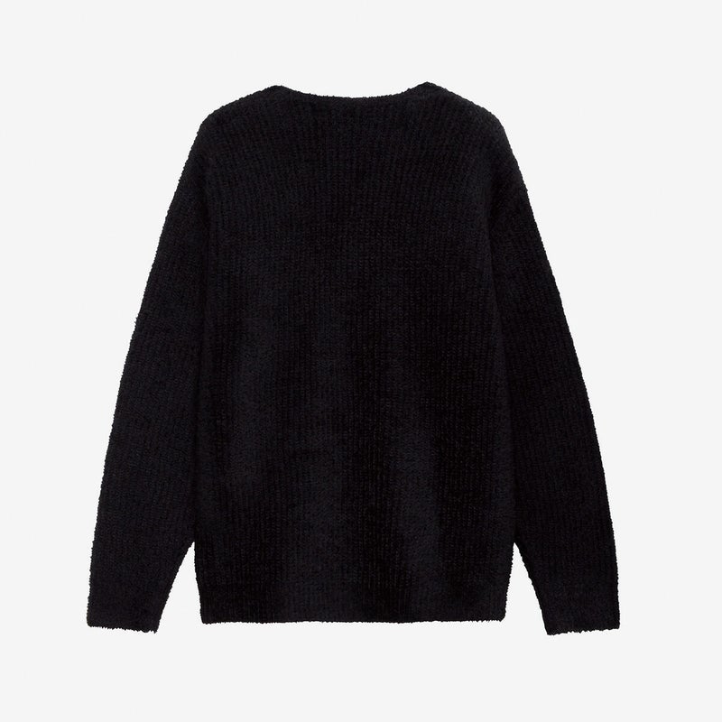 中空異形断面仮撚り糸を芯糸に巻き付けたフェザーヤーンを使用した軽量感がありながら保温性のあるニット。