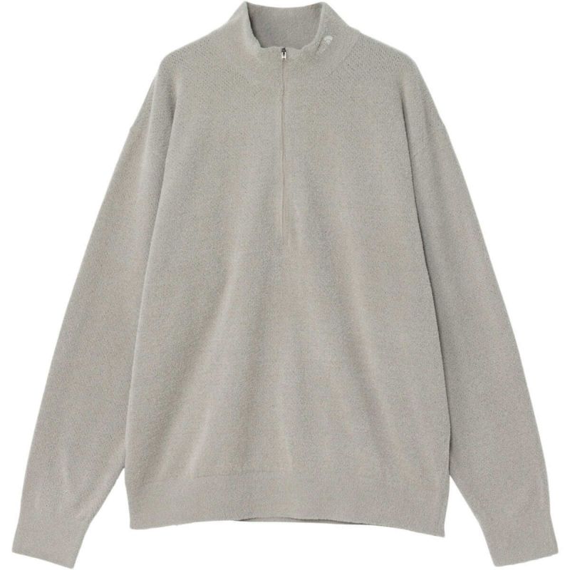 フリースジャケットのような軽量感と通気性が特徴のハーフジップのニットウエア。