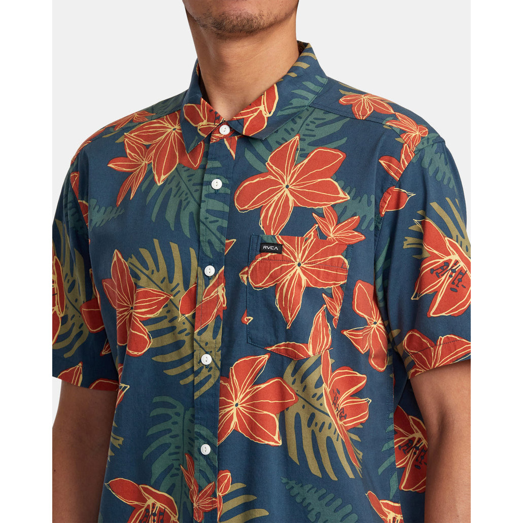 ルーカ(RVCA) ワイルド ハイビスカス ショート スリーブ ウーブン シャツ WILD HIBISCUS SHORT SLEEVE WOVEN SHIRT メンズ 半袖シャツ ダックブルー BE041125 BRK0
