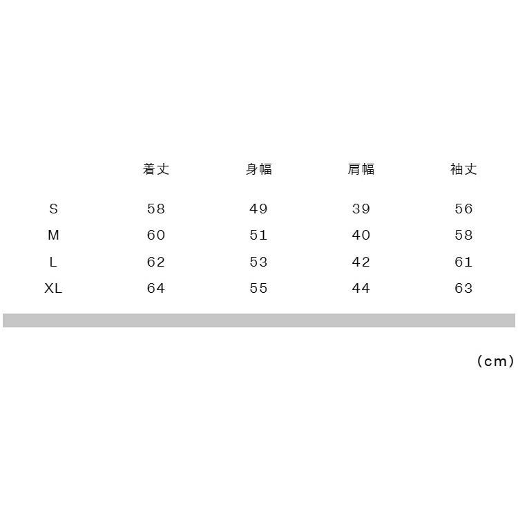 実寸サイズ(cm)S:着丈58、身幅49、肩幅39、袖丈56
