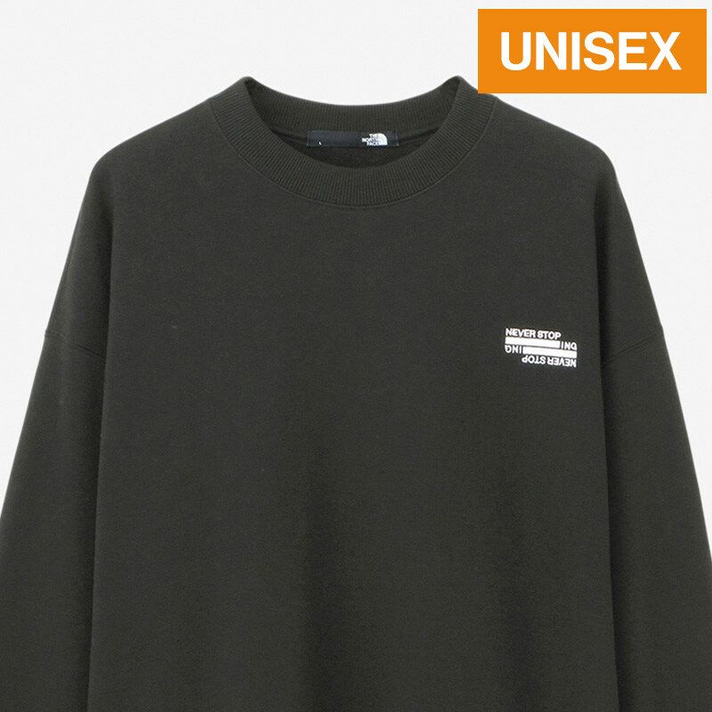 スウェットクルーの左胸に、メッセージ性の高いグラフィックを刺繍で配置しました。