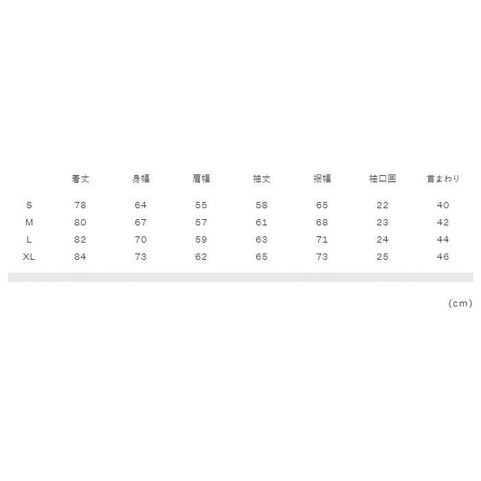 実寸サイズ(cm)S:着丈78、身幅64、肩幅55、袖丈58、裾幅65、袖口囲22、首まわり40