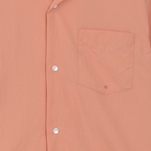 ややオーバーサイズのボックスシルエットで、ネックラインは開襟タイプ。
