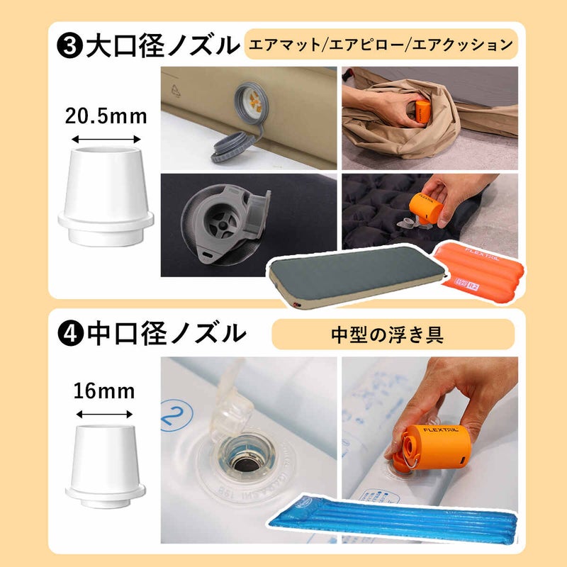インフレータブルマットや浮き輪、布団圧縮袋などの空気入れ・空気抜きに加え、焚き火の火起こしとしてもご使用いただけます。