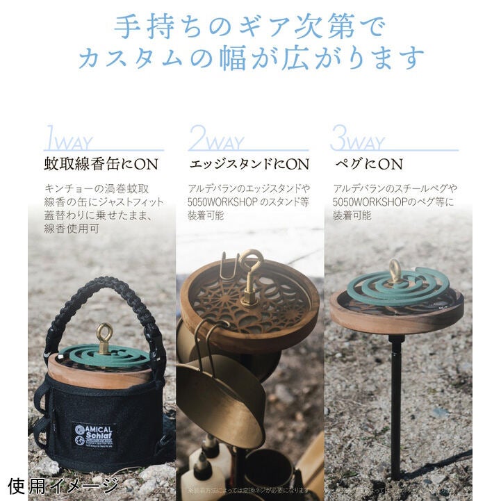 またはエッジスタンドのペグのトップに取り付ける事で、クレー等ペグダウン可能フィールドであれば差し込んで、蚊取線香刺しにも。