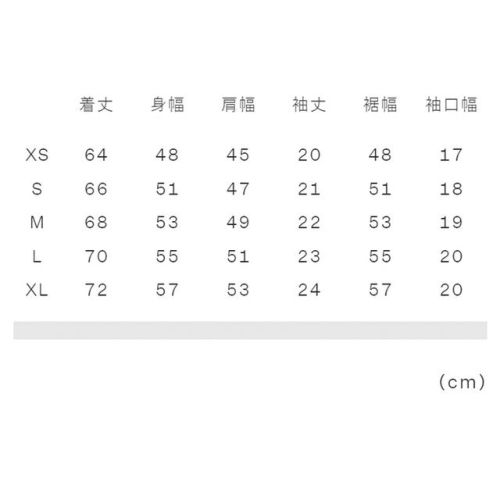 XS:着丈64、身幅48、肩幅45、袖丈20、裾幅48、袖口幅17 S:着丈66、身幅51、肩幅47、袖丈21、裾幅51、袖口幅18 M:着丈68、身幅53、肩幅49、袖丈22、裾幅53、袖口幅19 X:着丈70、身幅55、肩幅51、袖丈23、裾幅55、袖口幅20 XL:着丈72、身幅57、肩幅53、袖丈24、裾幅57、袖口幅20 |