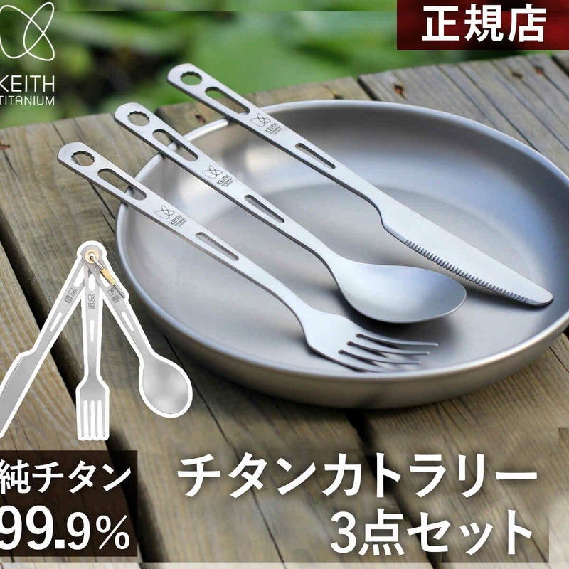・純チタン製のポータブル屋外食器ナイフ、フォーク、スプーンの3点セット。