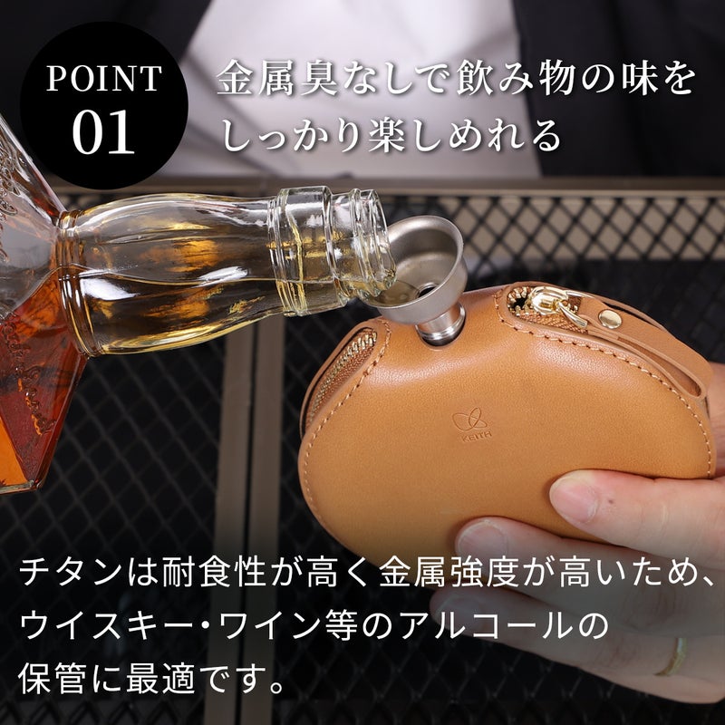 チタンは耐食性が高いため、ウイスキーやワインなどのアルコールの保管に最適です。なお、炭酸飲料は入れないでください。