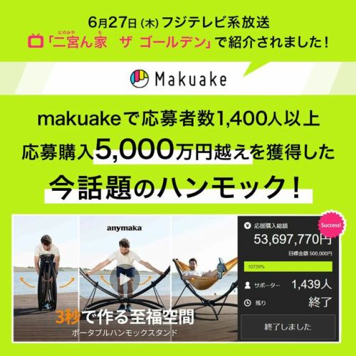Makuake(マクアケ)にて、約5,000万円の応援購入額を獲得した大注目のポータブルハンモック!