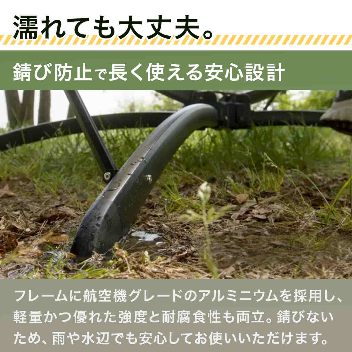 ・フレームに航空機グレードのアルミニウムを採用し、軽量かつ優れた強度と耐腐食性も両立(錆防止仕上げ)。