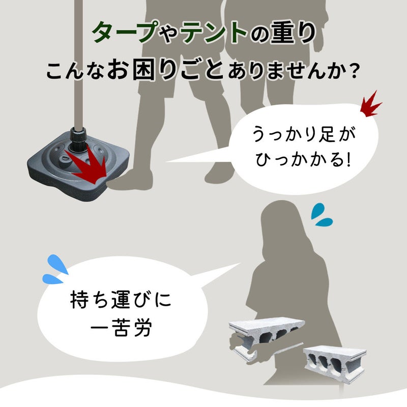 スリムな形状で足元の邪魔にならず、ペグダウンできない場所での設営に重宝します。