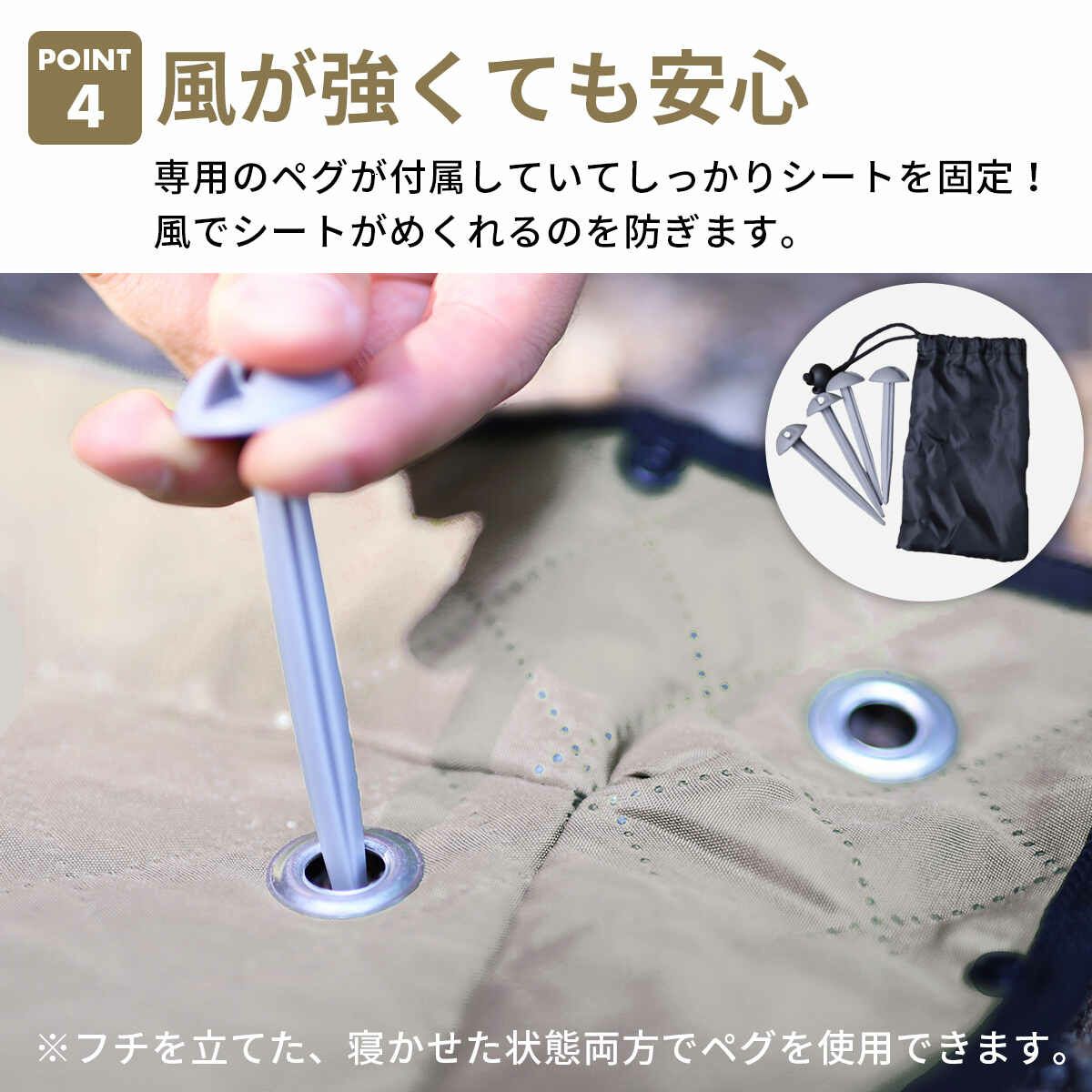 ・シートの反り返し防止用のペグ付き。
