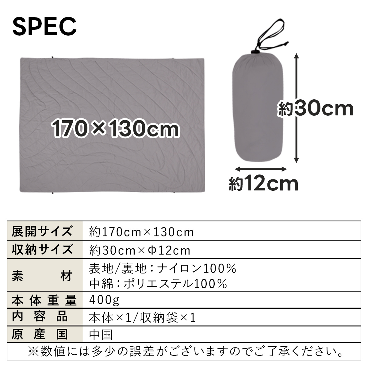 展開時のサイズは約170cm×130cmの大判サイズで、収納時は約30cm×Φ12cmとコンパクトになります。