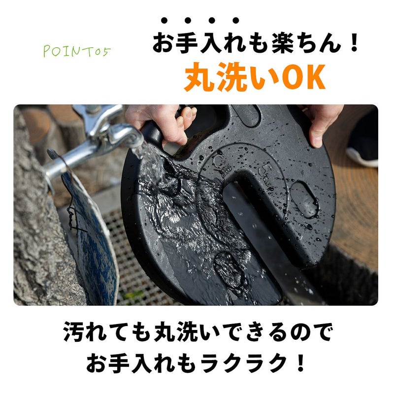 テントやタープの固定(特にペグが打てない場所)、サッカーゴールの固定、看板やオーニングの重りとしてなど、多用途にご使用いただけます。