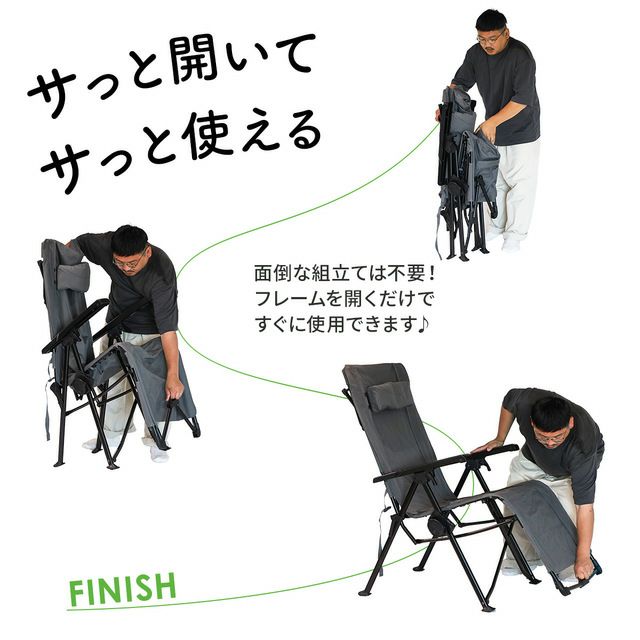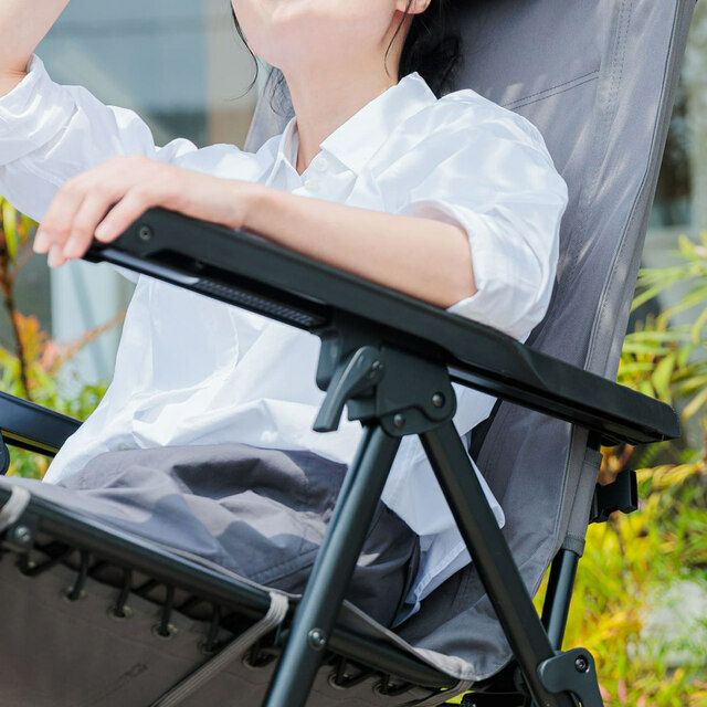 重力を忘れるような心地よさ。自由自在なリクライニングで、アウトドアのくつろぎを無限大に。コンパクトに収納できる収束フレームで、どこでも手軽にリラックス。