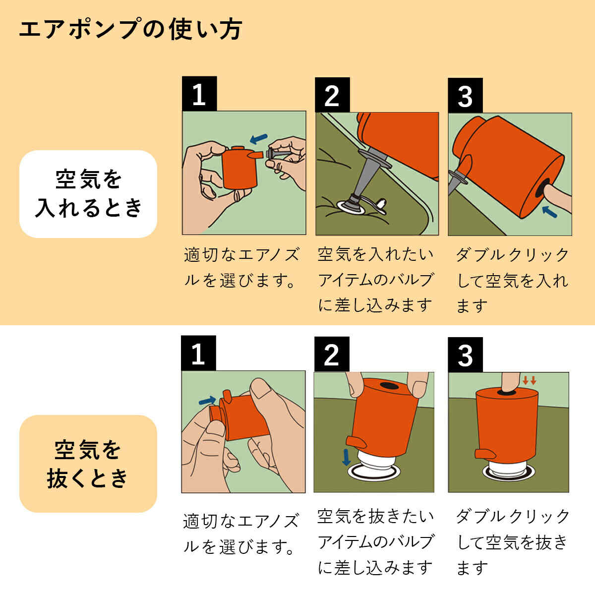 ・エアーマットや浮き輪などの空気入れ ・圧縮袋の空気抜き ・焚き火の火おこし ・キーボードや車内の埃とり ・テント内のランタン |