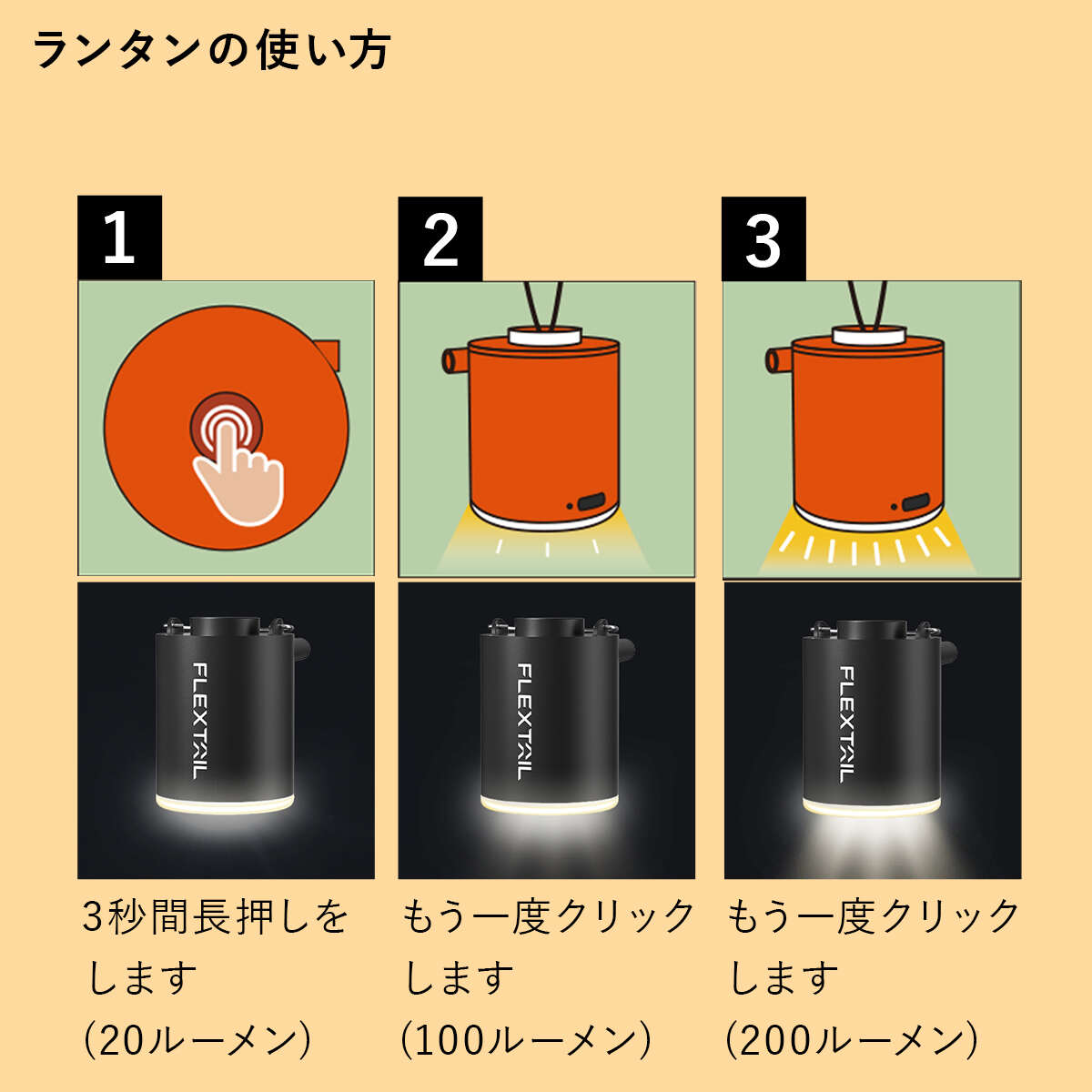 ・LEDランタン機能付き(50/160/400ルーメン)。