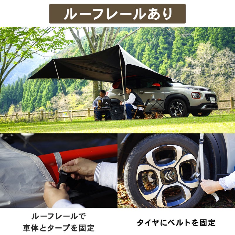 ・車のホイールやルーフキャリア等車体にタープを固定できる専用パーツ付き。