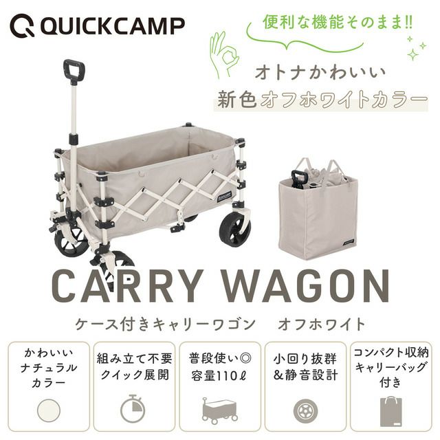 他の画像を見る 即納 クイックキャンプ(QUICKCAMP) ケース付き アウトドアワゴン オフホワイト キャリーカート QC-CW80 販売価格 ¥ 8,980 税込 %OFF 沢山積めるのにコンパクト収納。車のトランクや倉庫が汚れない、タイヤまですっぽり保護するキャリーバッグ型収納袋付き。 詳細を見る お気に入り登録