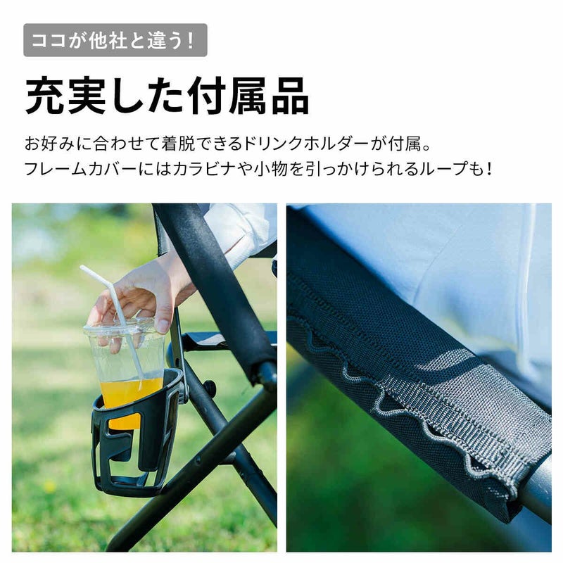 着脱可能なドリンクホルダーが付属するほか、フレームカバーには小物を掛けられるループが付いています。