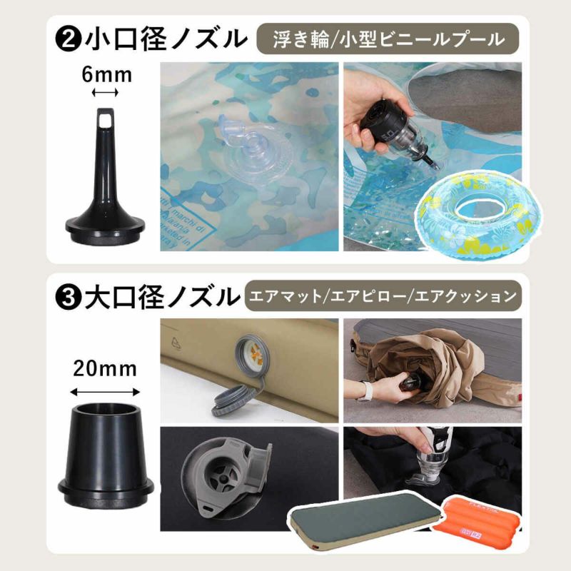 浮き輪やマットはもちろん、家庭用の大型プールやエアベッドの空気入れ・空気抜きをスピーディに行うことができます。