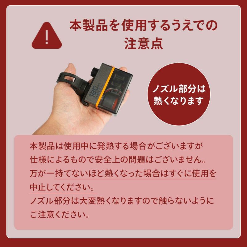 ノズル装着をする金属部分は特に熱くなるため触らないでください。