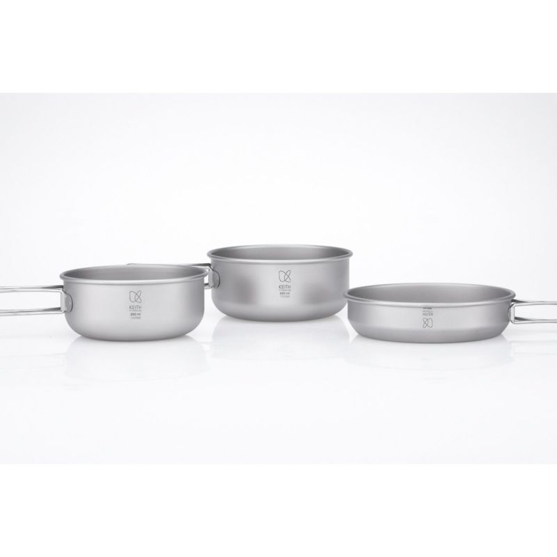 容量の異なるチタンポット(500ml、550ml、680ml)の3点セットです。