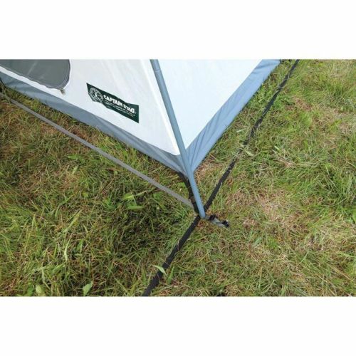 別売のポール2本、ガイドロープ2本を使用することで、後面・出入口兼用のひさしを張り出し可能。