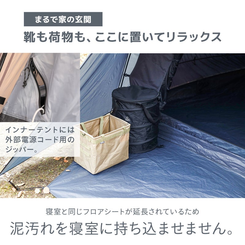 耐水圧2000mmの生地を使用し、縫い目にはシームテープ加工を施しているため急な悪天候でも安心です。また、床付きの前室があり荷物や靴を雨から守れます。