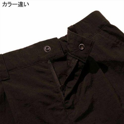 ドットボタンとファスナーによる前開きの仕様で、ウエストにはベルトループを配しています。