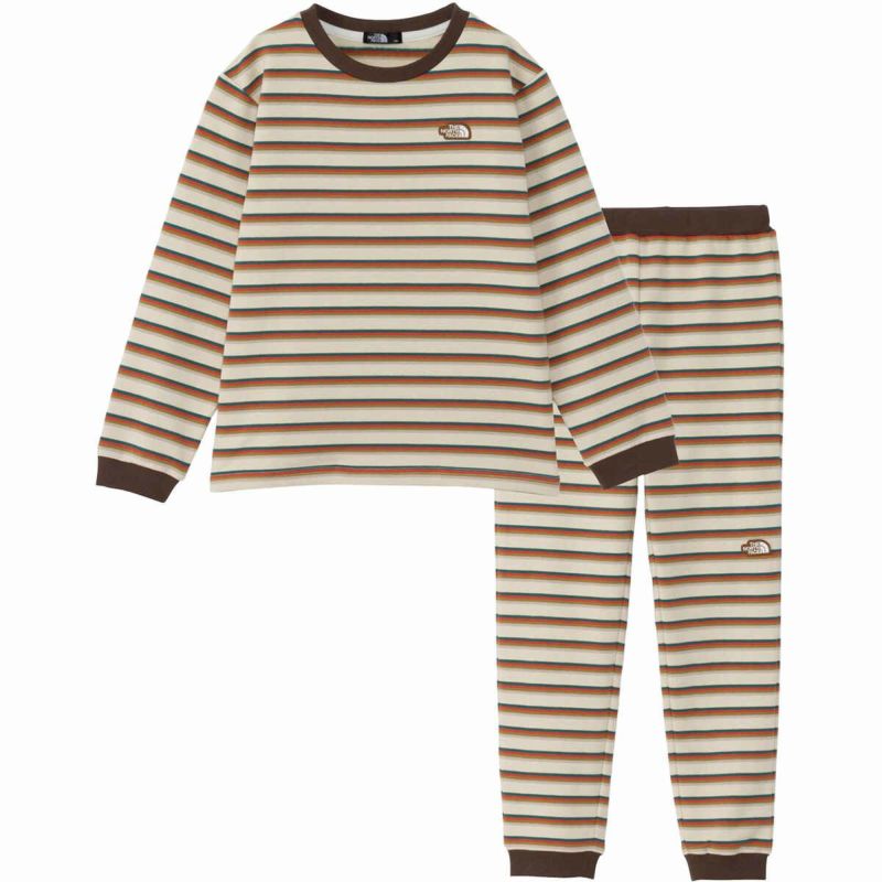 キャンプ時にテントでリラックスして過ごすシーンを想定した、長袖のクルーネックシャツとパンツのセット。