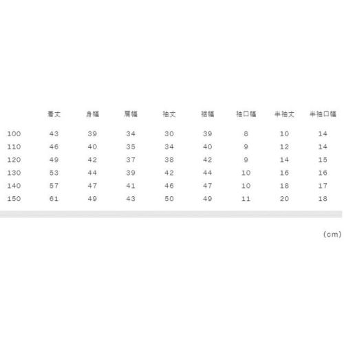 100:着丈43、身幅39、肩幅34、袖丈30、裾幅39、袖口幅8、半袖丈10、半袖口幅14 110:着丈46、身幅40、肩幅35、袖丈34、裾幅40、袖口幅9、半袖丈12、半袖口幅14 120:着丈49、身幅42、肩幅37、袖丈38、裾幅42、袖口幅9、半袖丈14、半袖口幅15 130:着丈53、身幅44、肩幅39、袖丈42、裾幅44、袖口幅10、半袖丈16、半袖口幅16 140:着丈57、身幅47、肩幅41、袖丈46、裾幅47、袖口幅10、半袖丈18、半袖口幅17 150:着丈61、身幅49、肩幅43、袖丈50、裾幅49、袖口幅11、半袖丈20、半袖口幅18 |