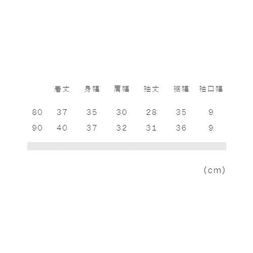 80:着丈37、身幅35、肩幅30、袖丈28、裾幅35、袖口幅9 90:着丈40、身幅37、肩幅32、袖丈31、裾幅36、袖口幅9 |