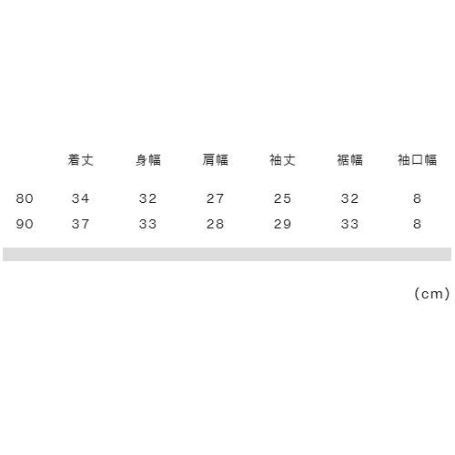 80:着丈34、身幅32、肩幅27、袖丈25、裾幅32、袖口幅8 90:着丈37、身幅33、肩幅28、袖丈29、裾幅33、袖口幅8 |