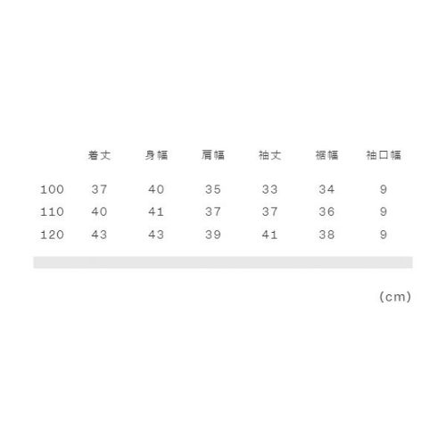 100:着丈37、身幅40、肩幅35、袖丈33、裾幅34、袖口幅9 110:着丈40、身幅41、肩幅37、袖丈37、裾幅36、袖口幅9 120:着丈43、身幅43、肩幅39、袖丈41、裾幅38、袖口幅9 |
