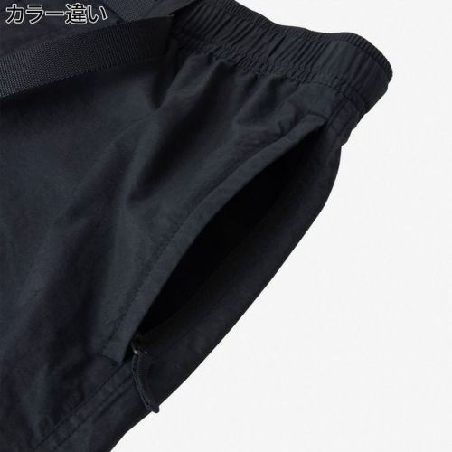 ウエストはウェビングベルト仕様で、左右サイドと右ヒップにファスナーポケットを配置。