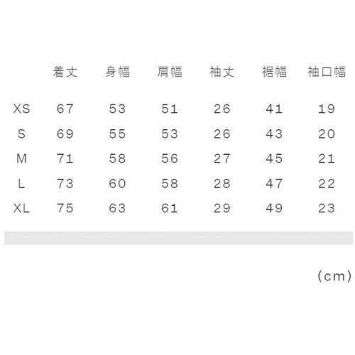 XS:着丈67、身幅53、肩幅51、袖丈26、裾幅41、袖口幅19 S:着丈69、身幅55、肩幅53、袖丈26、裾幅43、袖口幅20 M:着丈71、身幅58、肩幅56、袖丈27、裾幅45、袖口幅21 L:着丈73、身幅60、肩幅58、袖丈28、裾幅47、袖口幅22 XL:着丈75、身幅63、肩幅61、袖丈29、裾幅49、袖口幅23 |