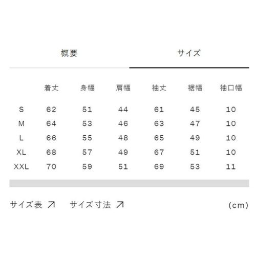 S:着丈62、身幅51、肩幅44、袖丈61、裾幅45、袖口幅10 M:着丈64、身幅53、肩幅46、袖丈63、裾幅47、袖口幅10 L:着丈66、身幅55、肩幅48、袖丈65、裾幅49、袖口幅10 XL:着丈68、身幅57、肩幅49、袖丈67、裾幅51、袖口幅10 XXL:着丈70、身幅59、肩幅51、袖丈69、裾幅53、袖口幅11 |