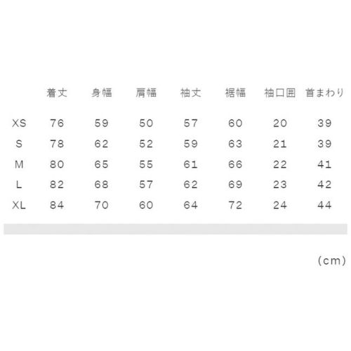 XS:着丈76、身幅59、肩幅50、袖丈57、裾幅60、袖口囲20、首まわり39 S:着丈78、身幅62、肩幅52、袖丈59、裾幅63、袖口囲21、首まわり39 M:着丈80、身幅65、肩幅55、袖丈61、裾幅66、袖口囲22、首まわり41 L:着丈82、身幅68、肩幅57、袖丈62、裾幅69、袖口囲23、首まわり42 XL:着丈84、身幅70、肩幅60、袖丈64、裾幅72、袖口囲24、首まわり44 |
