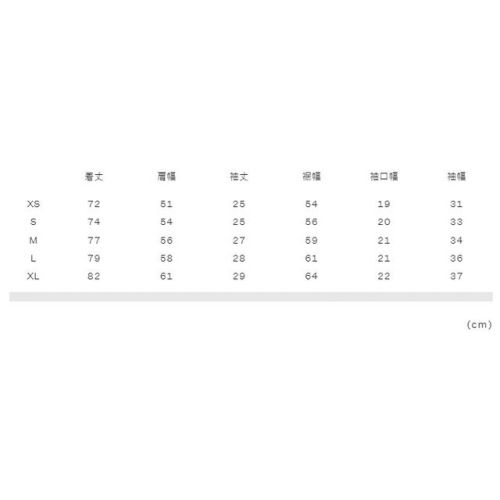XS:着丈72、肩幅51、袖丈25、裾幅54、袖口幅19、袖幅31 S:着丈74、肩幅54、袖丈25、裾幅56、袖口幅20、袖幅33 M:着丈77、肩幅56、袖丈27、裾幅59、袖口幅21、袖幅34 L:着丈79、肩幅58、袖丈28、裾幅61、袖口幅21、袖幅36 XL:着丈82、肩幅61、袖丈29、裾幅64、袖口幅22、袖幅37 |