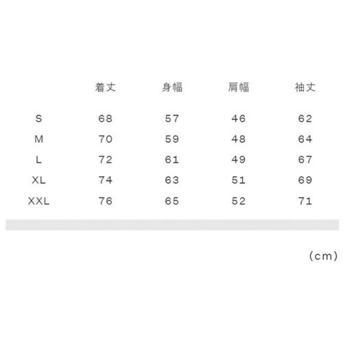S:着丈68、身幅57、肩幅46、袖丈62 M:着丈70、身幅59、肩幅48、袖丈64 L:着丈72、身幅61、肩幅49、袖丈67 XL:着丈74、身幅63、肩幅51、袖丈69 XXL:着丈76、身幅65、肩幅52、袖丈71 |