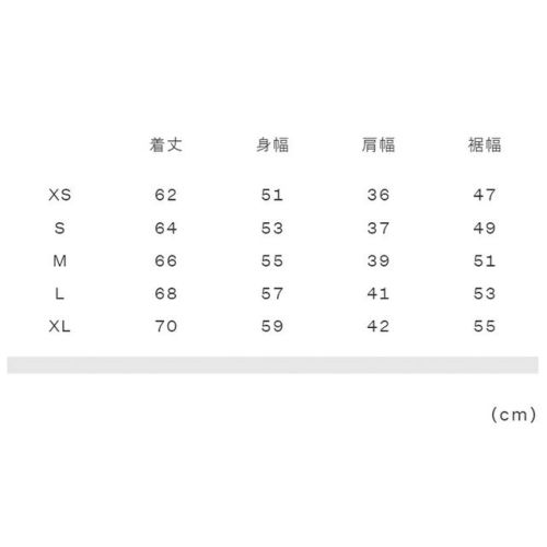 XS:着丈62、身幅51、肩幅36、裾幅47 S:着丈64、身幅53、肩幅37、裾幅49 M:着丈66、身幅55、肩幅39、裾幅51 L:着丈68、身幅57、肩幅41、裾幅53 XL:着丈70、身幅59、肩幅42、裾幅55 |