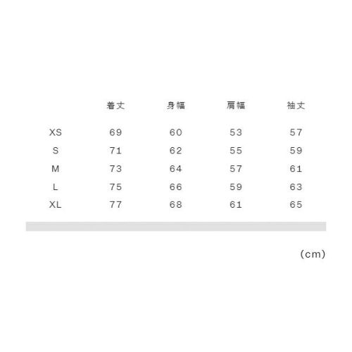 XS:着丈69、身幅60、肩幅53、袖丈57 S:着丈71、身幅62、肩幅55、袖丈59 M:着丈73、身幅64、肩幅57、袖丈61 L:着丈75、身幅66、肩幅59、袖丈63 XL:着丈77、身幅68、肩幅61、袖丈65 |